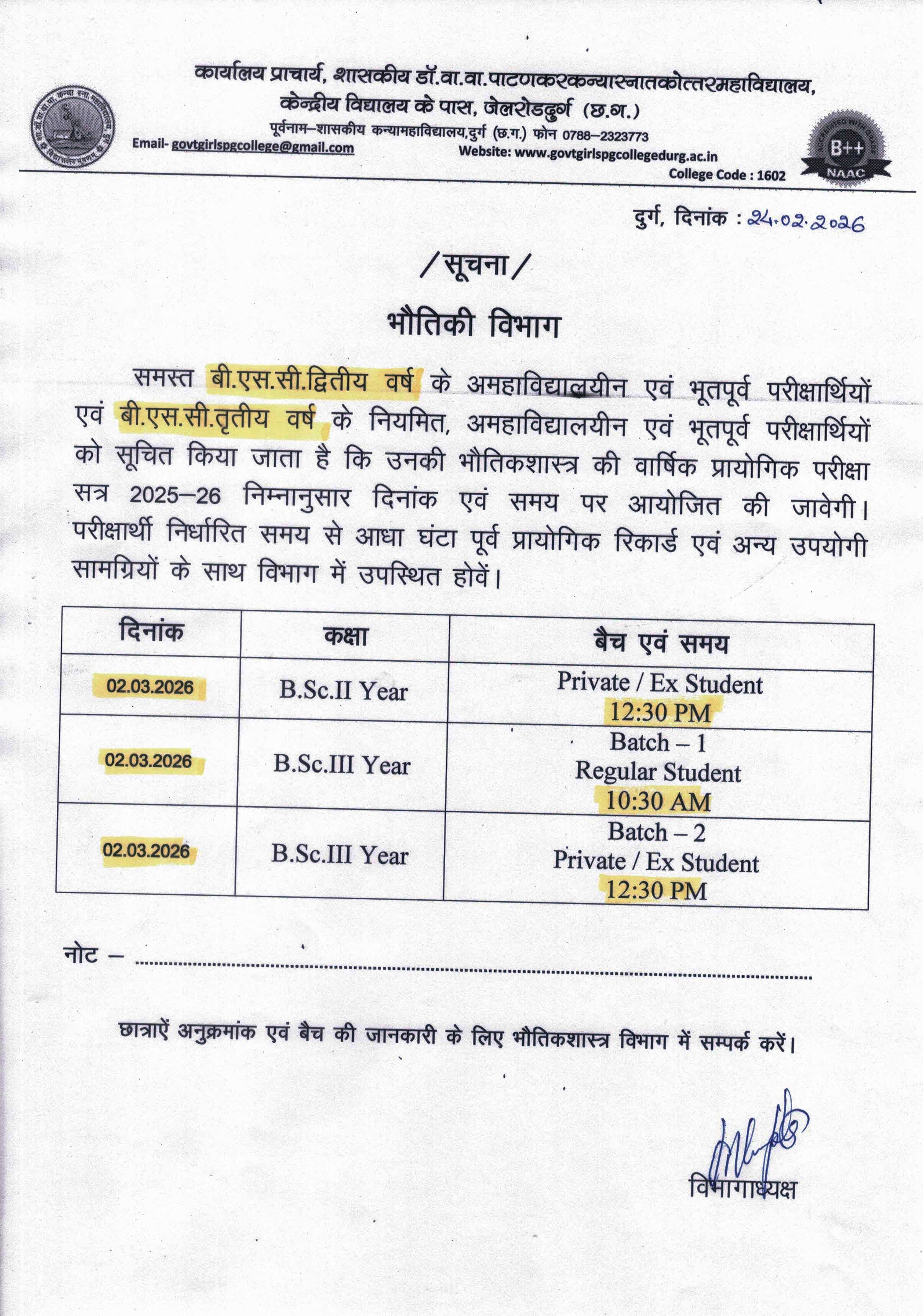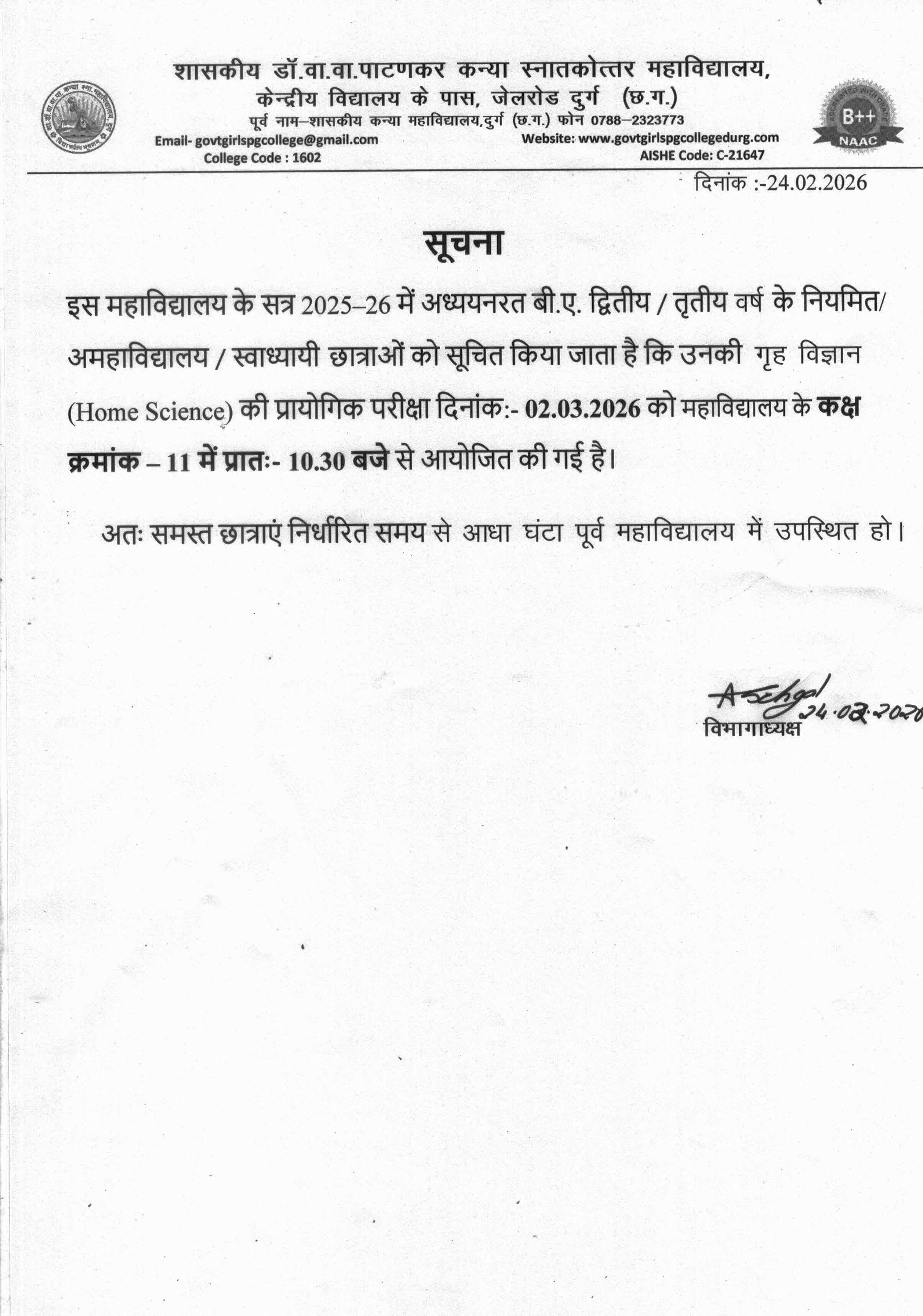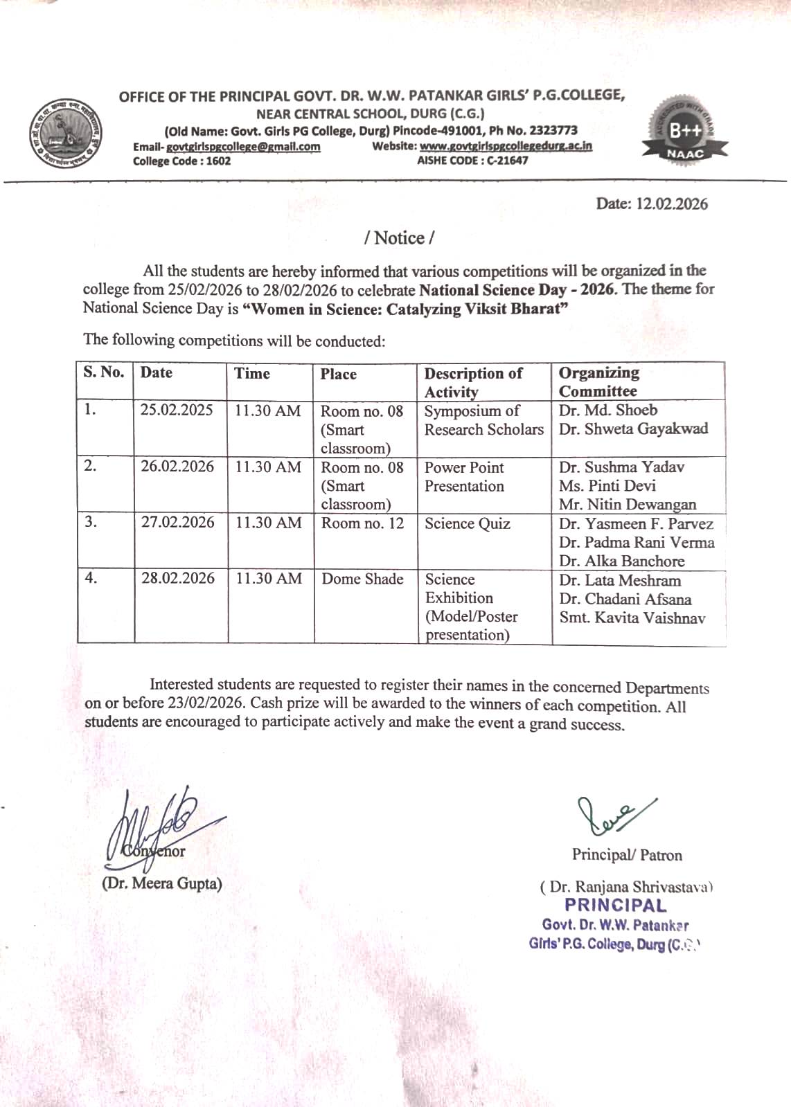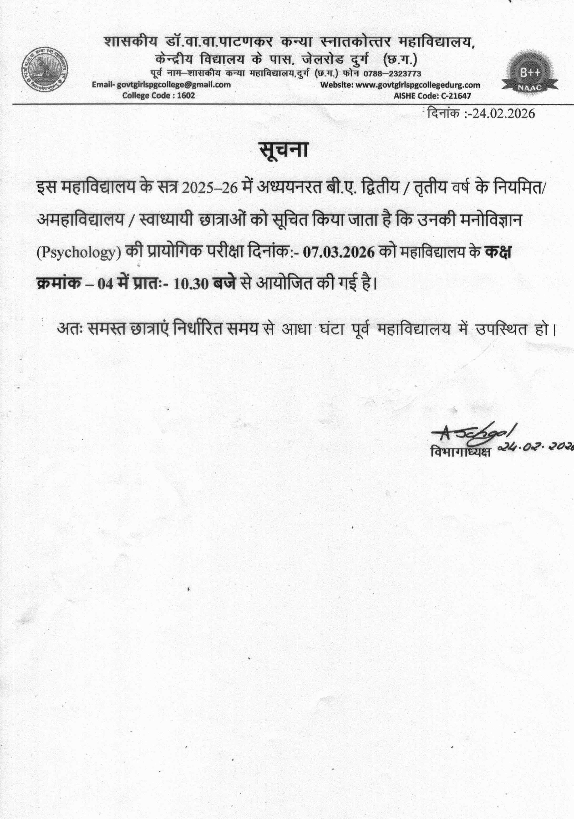 Govt. Dr. Waman Wasudev Patankar Girls PG College Durg